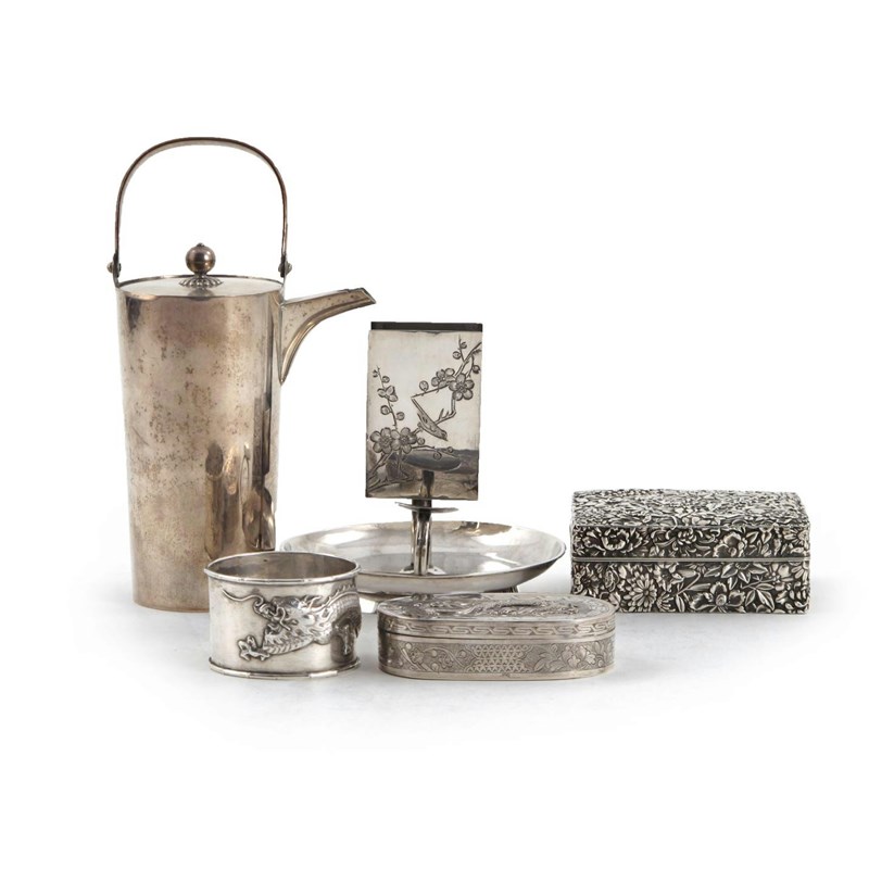 A small collection of silver items 19th/20th century, comprising a Chinese silver napkin ring applied with a dragon and with the initials 'E F K', a snuff box, a box with a flower design, a small Japanese coffee pot and cover and a match box holder with ash tray, two with punch marks to the base, 12.7cm. (8)