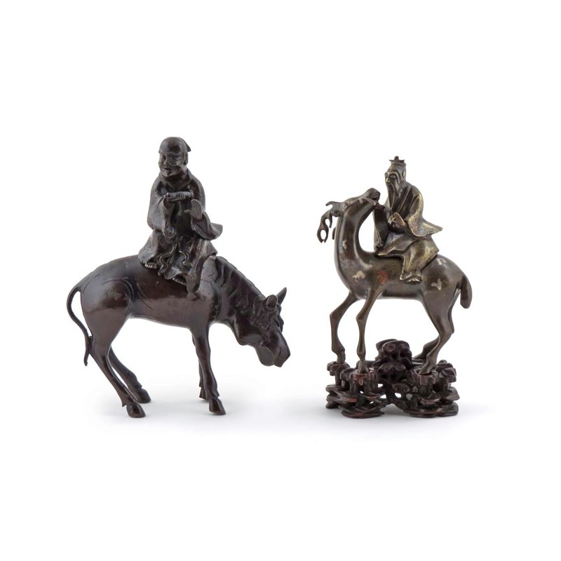 Two Chinese bronze incense burners 17th century and later, each modelled as a sage, one riding a mule, the other a deer and inlaid with silver wire, the latter with a hardwood stand carved with lingzhi, 23.8cm max. (5)