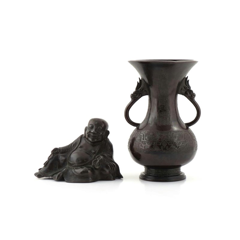 A Chinese bronze vase 19th century, the ovoid body cast in relief with taotie masks on a ground of key fret, the neck with acanthus leaves containing geometric designs, the handles with mythical beasts, and a bronze model of seated Budai He Shang, a happy expression on his face, 27.8cm. (2)