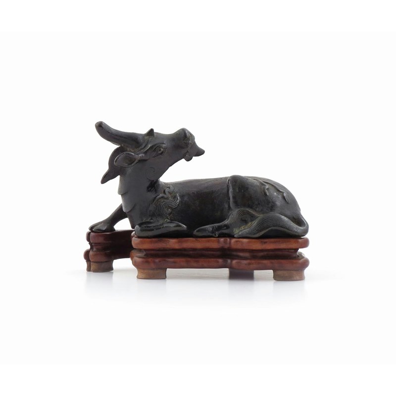 A Chinese bronze model of a recumbent kylin late Ming dynasty, its head turned over its back, its hooves tucked neatly beneath its body, together with a hardwood stand, 18cm. (2)