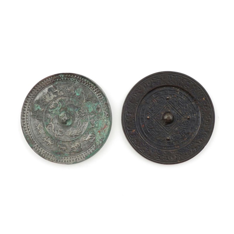 Two Chinese bronze mirrors Tang dynasty or later, one cast with dragons and kylin, the other with geometric designs, 13.2cm. (2)