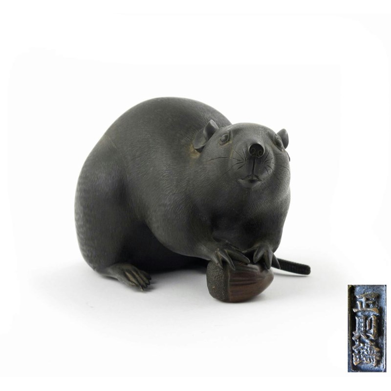 A Japanese bronze okimono Meiji 1868-1912, finely cast as a rat with its front paws resting on a chestnut, the belly signed Masanori, 16.5cm. (3)