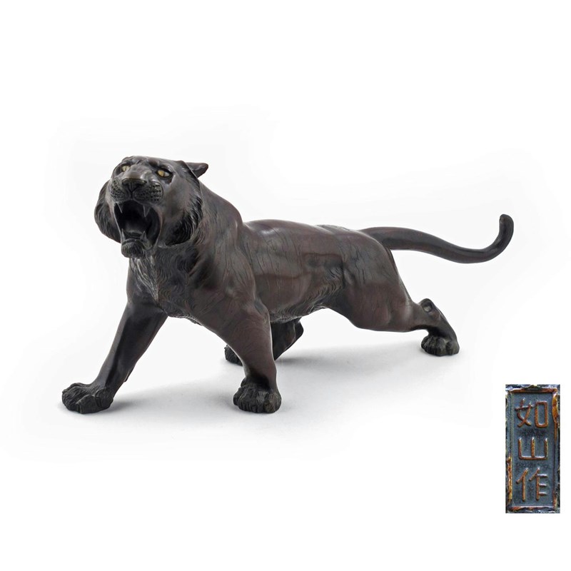 A Japanese bronze model of a tiger Meiji 1868-1912, with its head raised and baring its teeth, the eyes inset with glass, signed Jozan saku on its belly, 47.5cm.