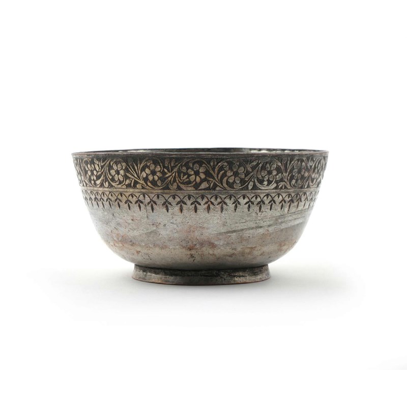 A Middle Eastern silvered copper bowl 19th century or earlier, the U-shaped body raised on a short flared foot and decorated with a scrolling foliate design, 18.5cm.