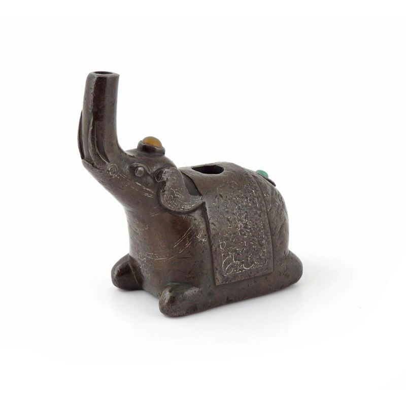A Chinese bronze water dropper 17th century, modelled as an elephant with its trunk raised, decorated with silver inlay, 9cm.