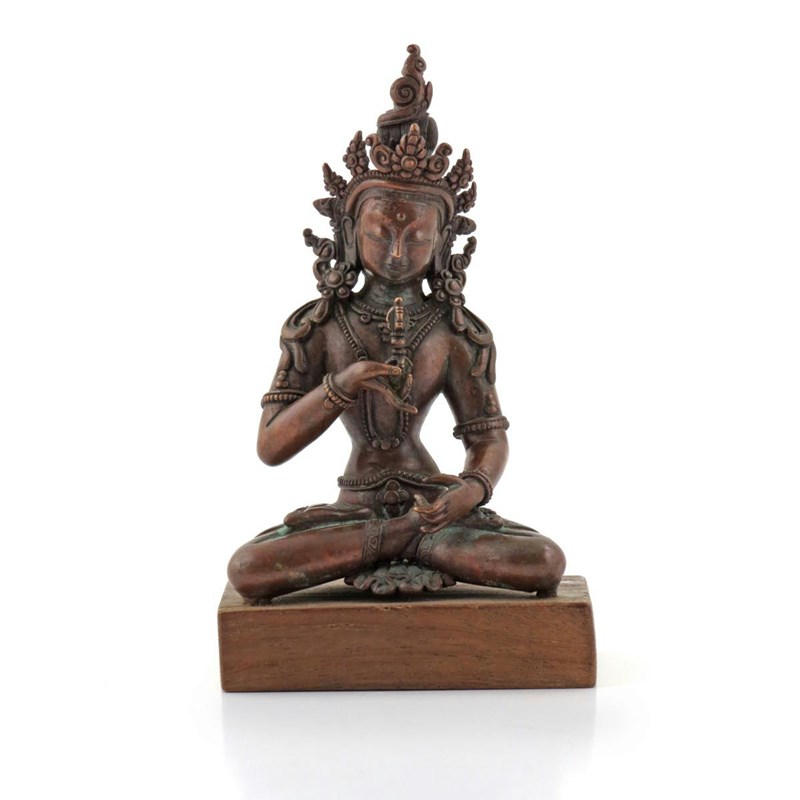 A Chinese coppery-bronze seated model of Vajrasattva probably 16th century, wearing an elaborate headdress and holding a vajra, mounted on a wood base, 14cm.