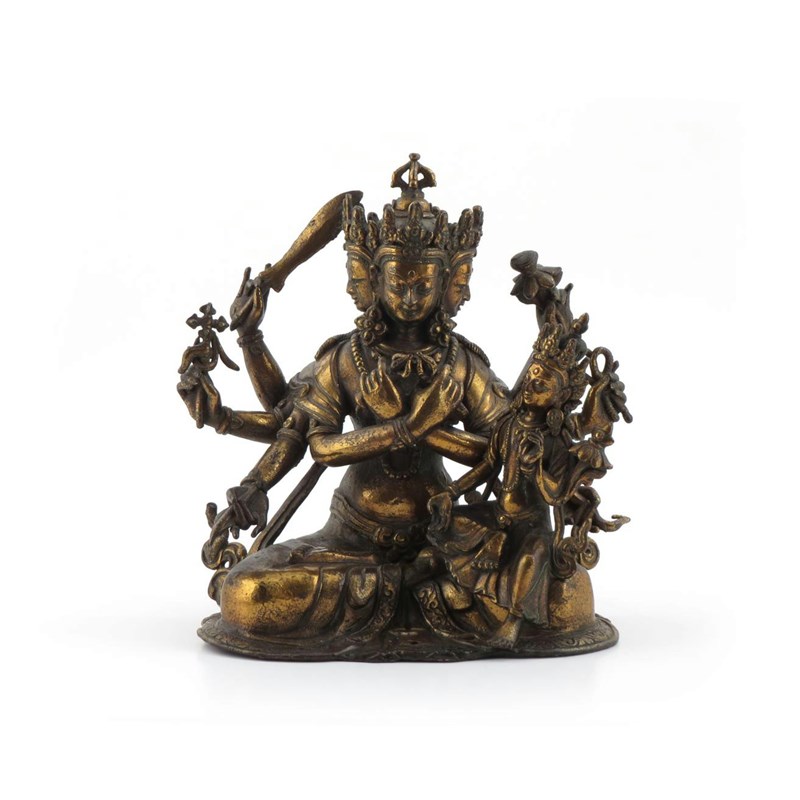 A Chinese gilt bronze model of Vijaya 20th century, the four-faced, eight-armed deity sitting holding various attributes, including a flaming sword and a pair of vajra, a smaller figure of Tara seated on her left knee, both adorned with necklaces and ribbons, 26cm high.