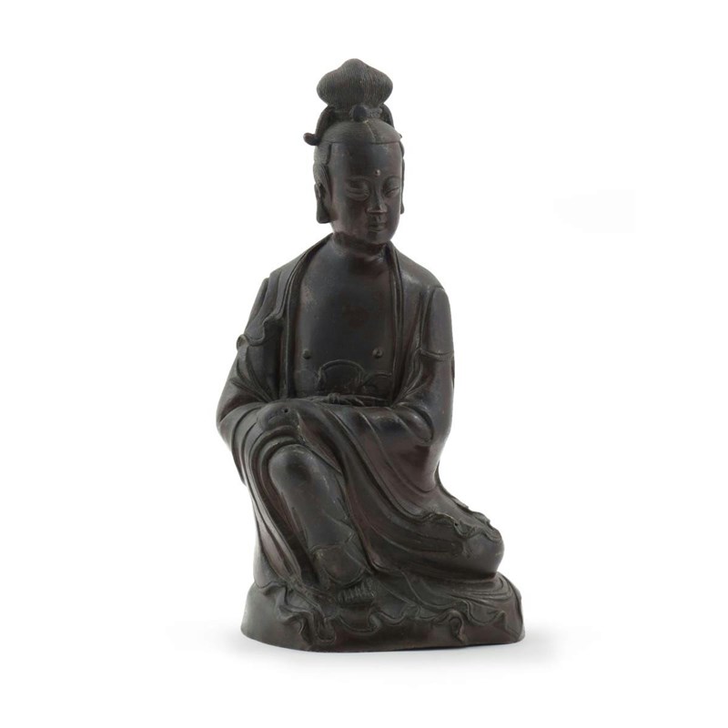 A Chinese bronze model of Guanyin 19th or 20th century, seated with one leg raised, wearing long flowing robes, 32cm.