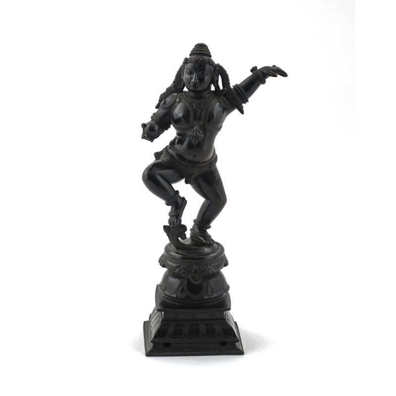 An Indian bronze model of Krishna 20th century, modelled in a dancing pose, holding a ball of butter in his right hand, his body adorned with jewelled necklaces and belts, raised on a high tiered lotus base, 34cm.