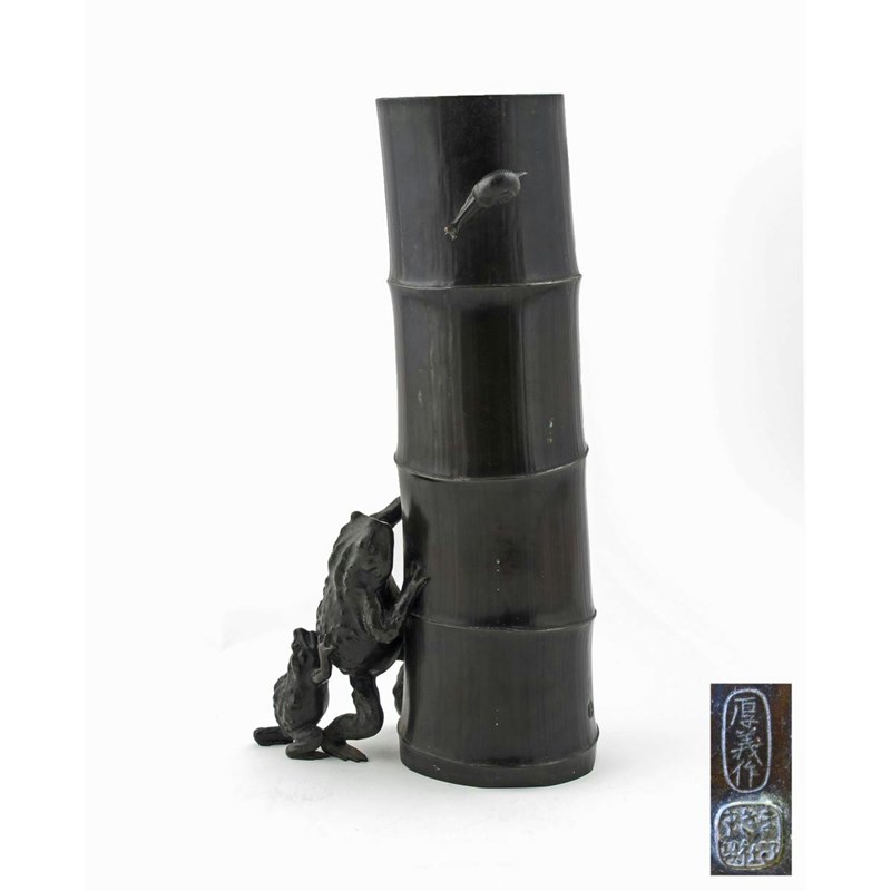 A Japanese bronze vase Meiji 1868-1912, the body shaped as a section of bamboo applied with two toads and a snail, the side signed Atsuyoshi saku and sealed Maruki Sha Chu Zo (made by the Maruki Company), attributed to Miyabe Atsuyoshi, 35cm.