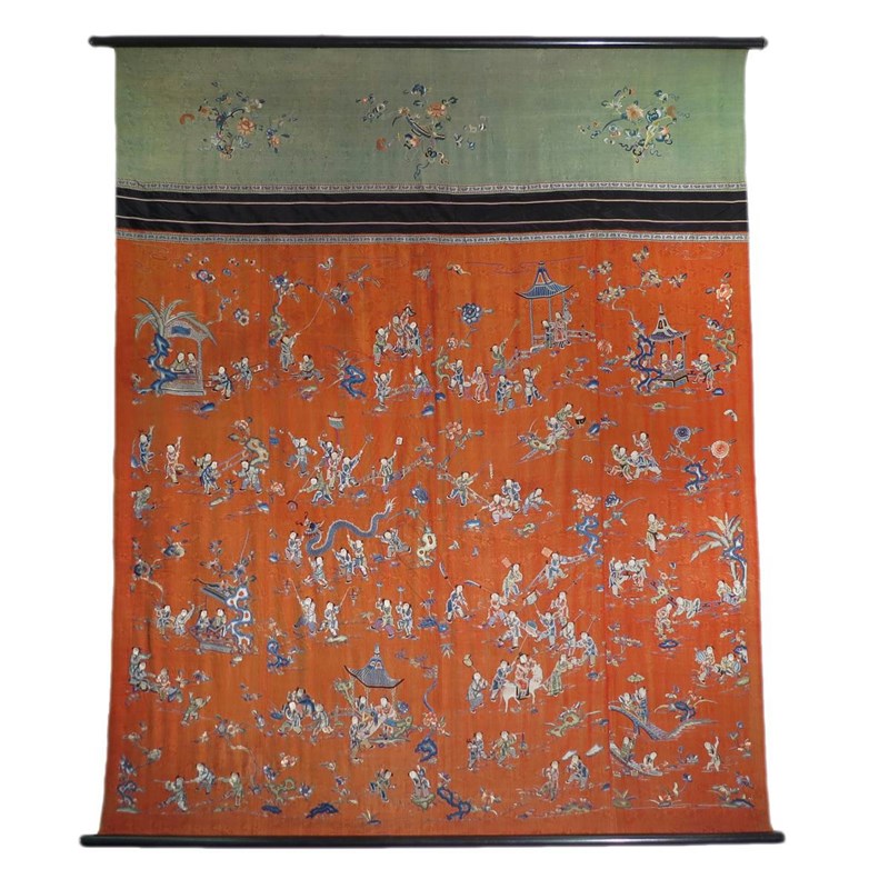 A large Chinese silk embroidered panel 19th century, decorated with many figures playing games, music, and enjoying festivities, reserved on a red ground, beneath a wide green band decorated with a basket of flowers and a bat, 229cm x 186cm.