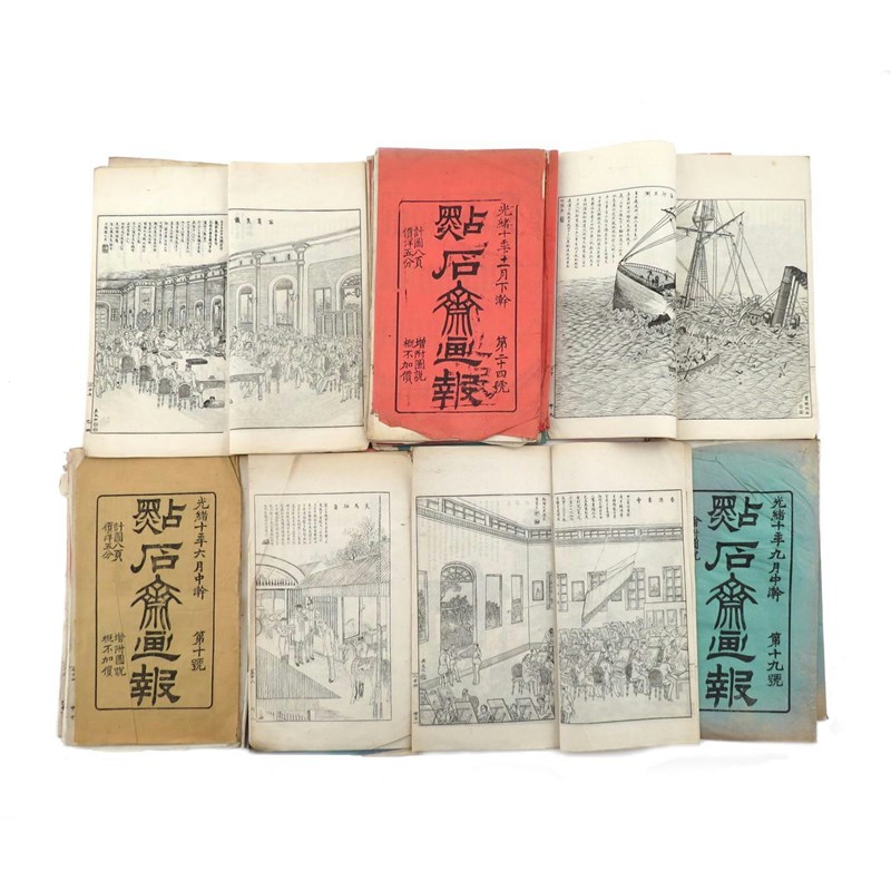 A collection of Chinese printed magazines, Dian Shi Zhai Hua Bao late 19th century, depicting figures in a variety of scenes in interiors and with boats, Immortals, animals and other scenes with calligraphy, 27cm x 14cm. (22)