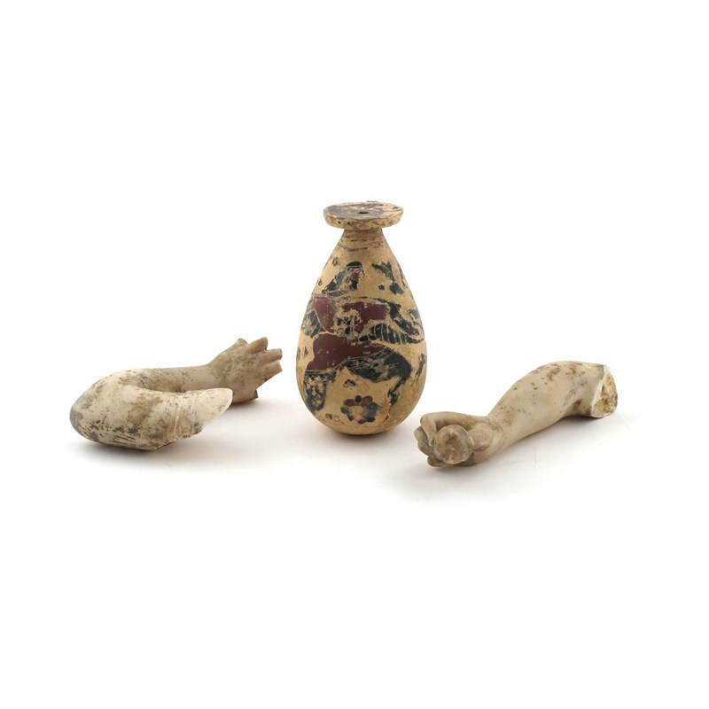 A Corinthian alabastron ovoid pottery jar 7th - 6th century BC, decorated with a winged figure and flowerheads, a pierced hole for suspension below the flat neck rim, together with two alabaster fragments of a figure's arms, one holding a small fruit, 23cm max. (3)