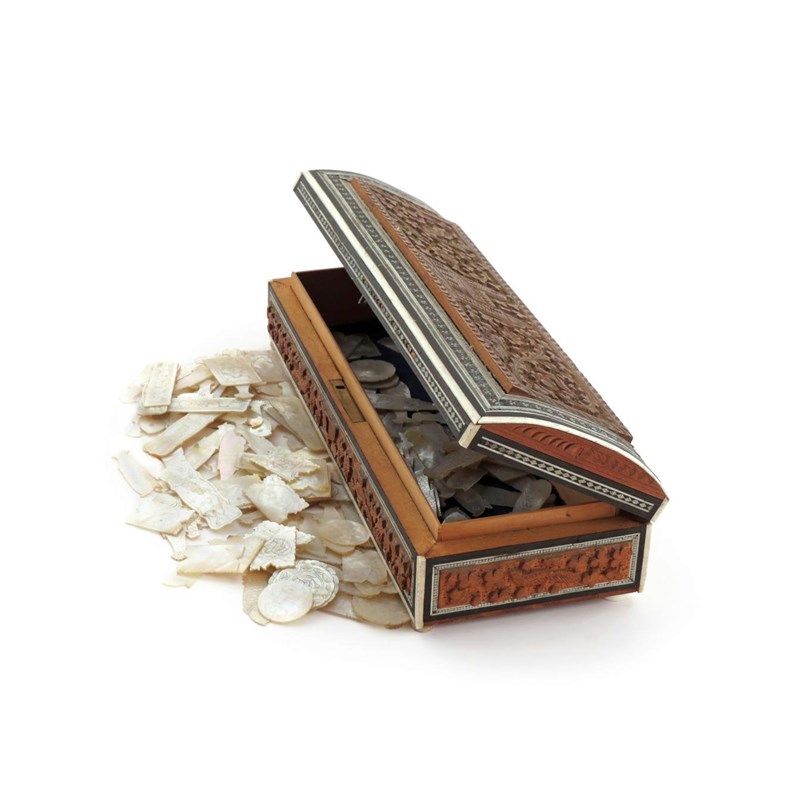 A collection of Chinese mother of pearl games counters 19th century, of square, circular, rectangular and fish form, incised with various designs, all contained in a rectangular wooden box, the hinged cover decorated with relief carving and geometric designs, 28.9cm. (A lot)