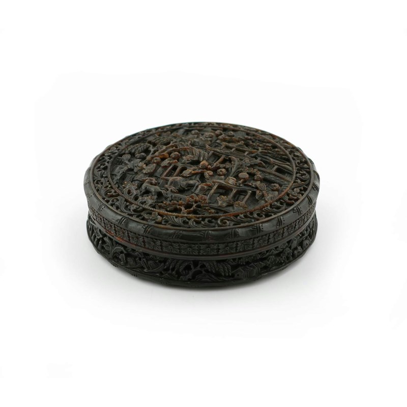 λ A Chinese Canton tortoiseshell circular box and cover 19th century, carved in relief with many figures engaged in various pursuits, with pagodas, pine and willow, all within a scrolling foliate border, the base similarly carved and with a vacant circular cartouche, 9.7cm. (2)