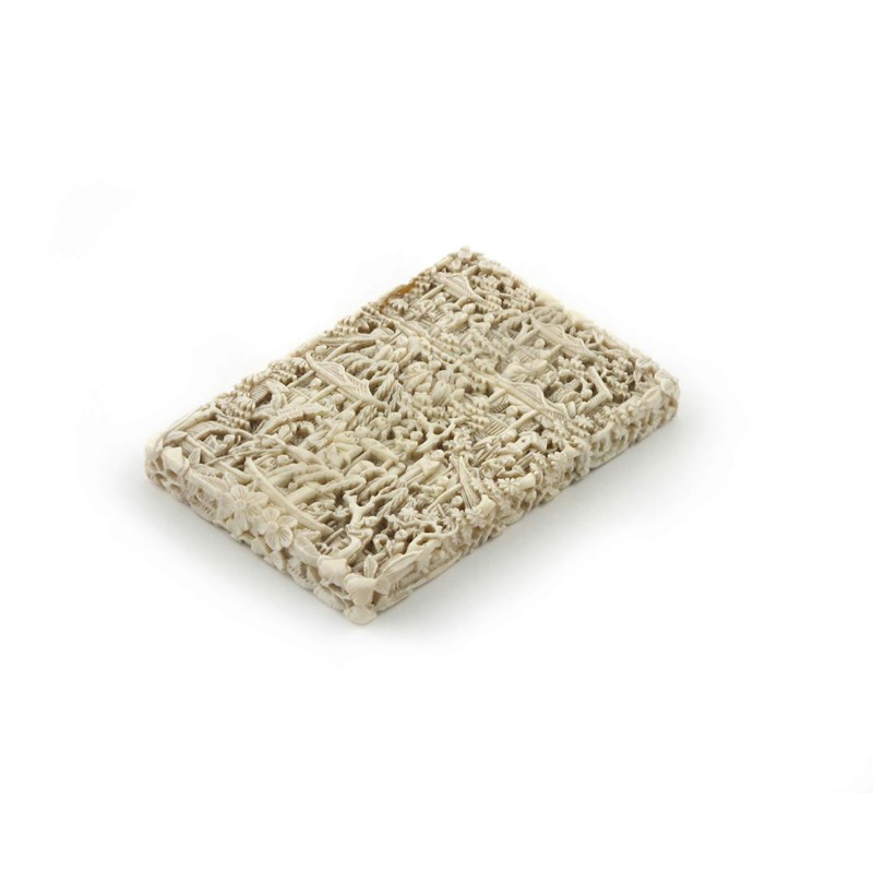 λ A Chinese Canton ivory card case 19th century, typically carved in relief with many figures with boats and pagodas, pine, willow and plantain, 11.cm. (2)