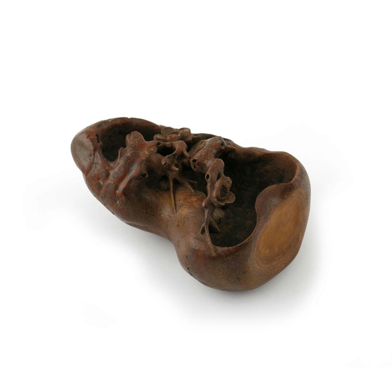 A Chinese bamboo brush washer 19th/20th century, carved as a gnarled blossoming prunus branch, the interior of the bamboo plant visible to one end, 18cm.