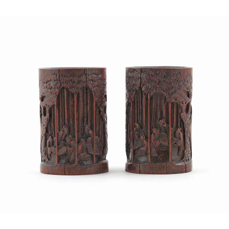 A pair of Chinese bamboo bitong 19th century, each carved with five scholars examining scrolls in a bamboo grove, 14.2cm. (2)