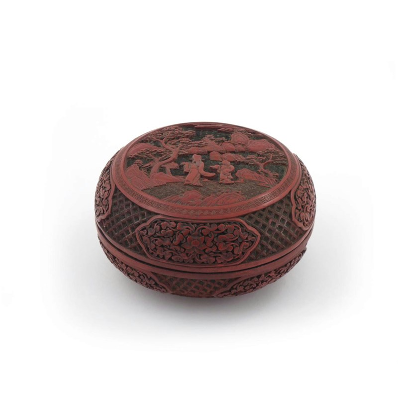 A Chinese red cinnabar lacquer circular box and cover 19th century, carved in relief with two figures beneath trees in a mountainous landscape, the sides with panels of flowers and foliage on a diaper ground, 20cm. (2)