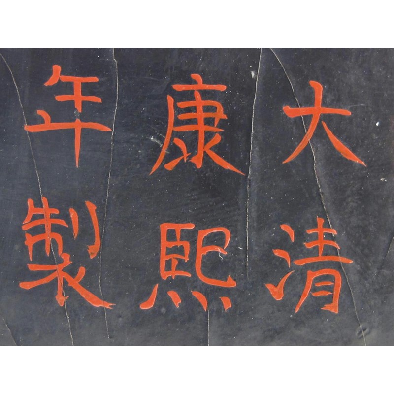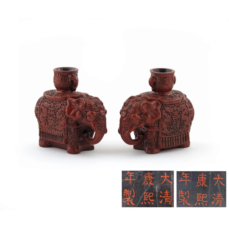 A pair of Chinese red cinnabar lacquer candlesticks 19th century, each modelled as a caparisoned elephant, carved in relief with scrolling foliate designs, the hanging cloth with characters to each side which read ji xiang and ping an, each with a six character Kangxi mark to the base, 17.8cm. (2)