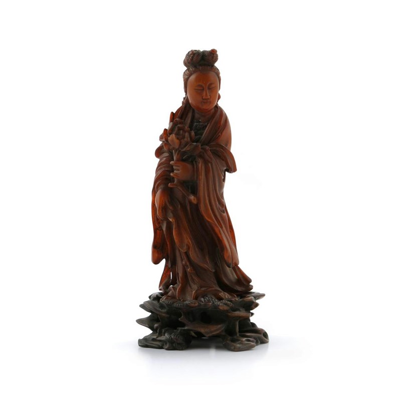 A good Chinese buffalo horn carving of Guanyin 19th century, standing with her feet bare, wearing long, billowing robes, her hair secured in a high elaborate chignon and holding a large peony bloom before her, a hardwood stand carved as rockwork, 10.5cm. (2)