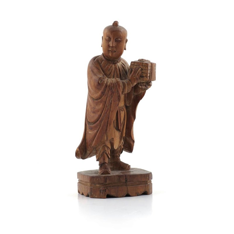 A Chinese carved wood model of a boy probably late Ming dynasty, standing wearing flowing robes, carrying five ribbon-tied tablets, with traces of pigment, 26.5cm.