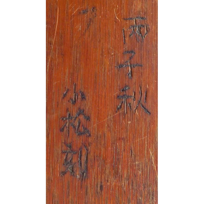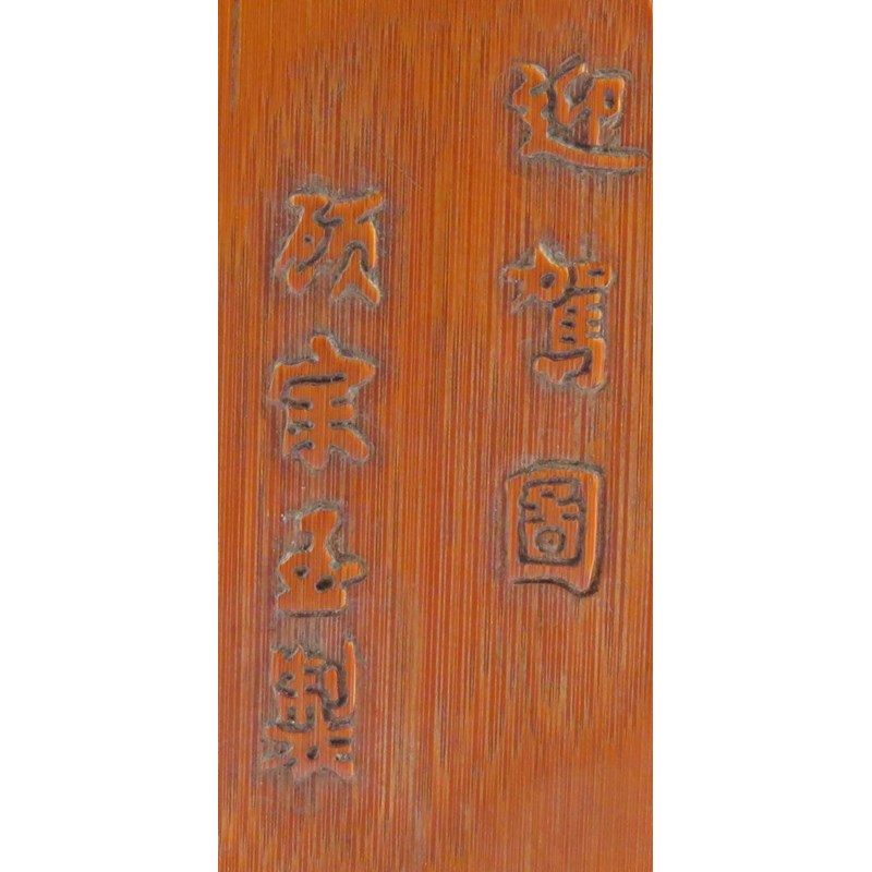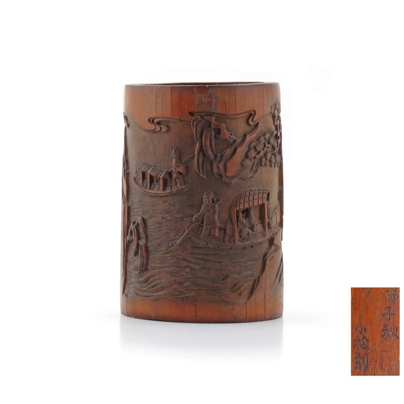 A Chinese bamboo bitong 20th century, carved in relief with figures in boats and seated at a table in a bamboo grove, with pine and rockwork, an inscription which reads bin zi qiu, xiao song ke, 19.6cm.