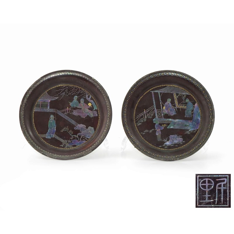 A pair of Chinese laque burgauté dishes 18th century, each inlaid with mother of pearl, depicting scenes from The Romance of the Western Chamber, with figures in rocky fenced gardens, a narrow geometric band to the rim, each with a mark which reads qian li, 12.4cm. (2)