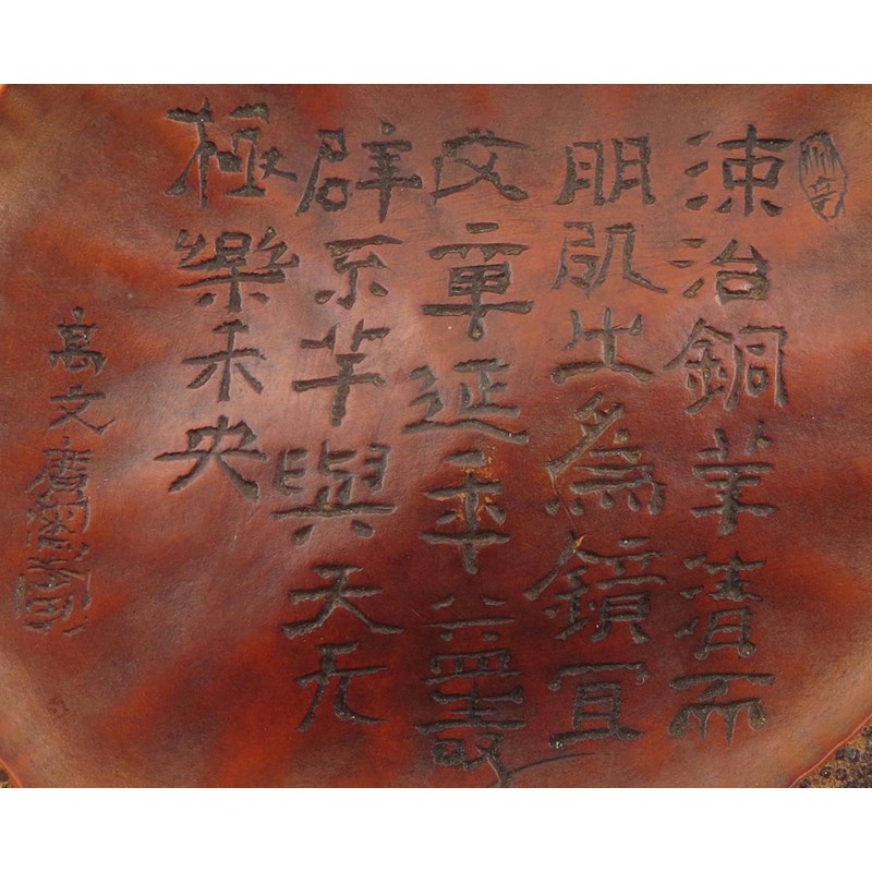 A Chinese oval bamboo pot and cover 19th/20th century, carved in relief to the exterior with scaly carp and other fish, the well with a further two fish, the cover with an oval panel containing stylized designs, the base carved with a poem, 10.9cm. (2)