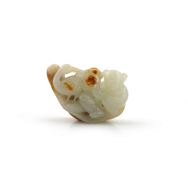 A Chinese pale celadon jade carving of a boy 19th/20th century, sitting holding a fruiting peach spray beside a single crane, all on a large curled leaf, the stone marked with russet, 5.2cm.