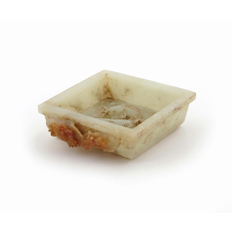A small Chinese pale celadon jade square dish probably late Ming dynasty, carved to the centre in high relief with two catfish, the exterior with a crab and a dragonfly perched on lotus leaves, with further leaves and flowers in shallow relief, the rim with a band of key fret, the stone with white-grey mottling, 8.1cm.