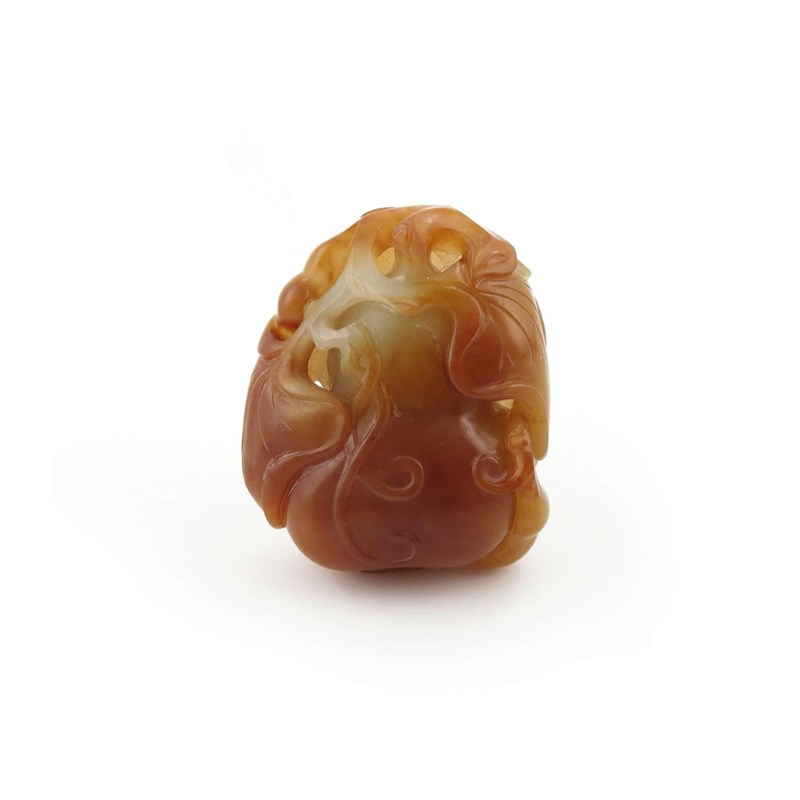 A Chinese russet and celadon jade carving of a gourd 19th or 20th century, issuing from a gnarled branch with curling tendrils of foliage and leaves, with other smaller fruits to the sides, 5.6cm.