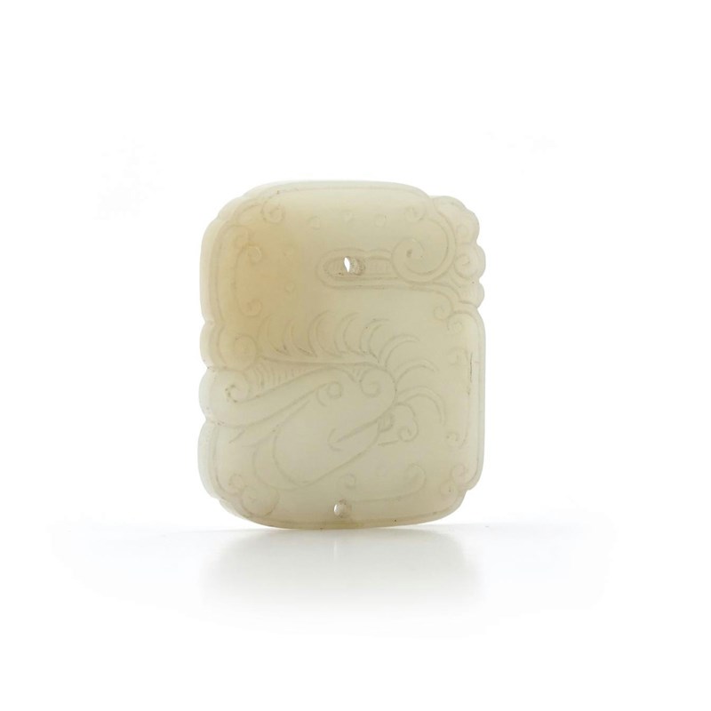 A Chinese celadon jade plaque 19th/20th century, carved in shallow relief to each side with a stylized dragon, with two pierced holes, 5.5cm.
