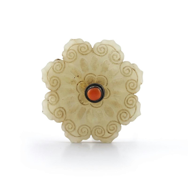 λ A Chinese celadon jade plaque 19th century, formed as a lobed flower and carved with ruyi-heads, the reverse with a swirling petal design, with a metal fitting mounted with a coral bead, 6.3cm. (2)