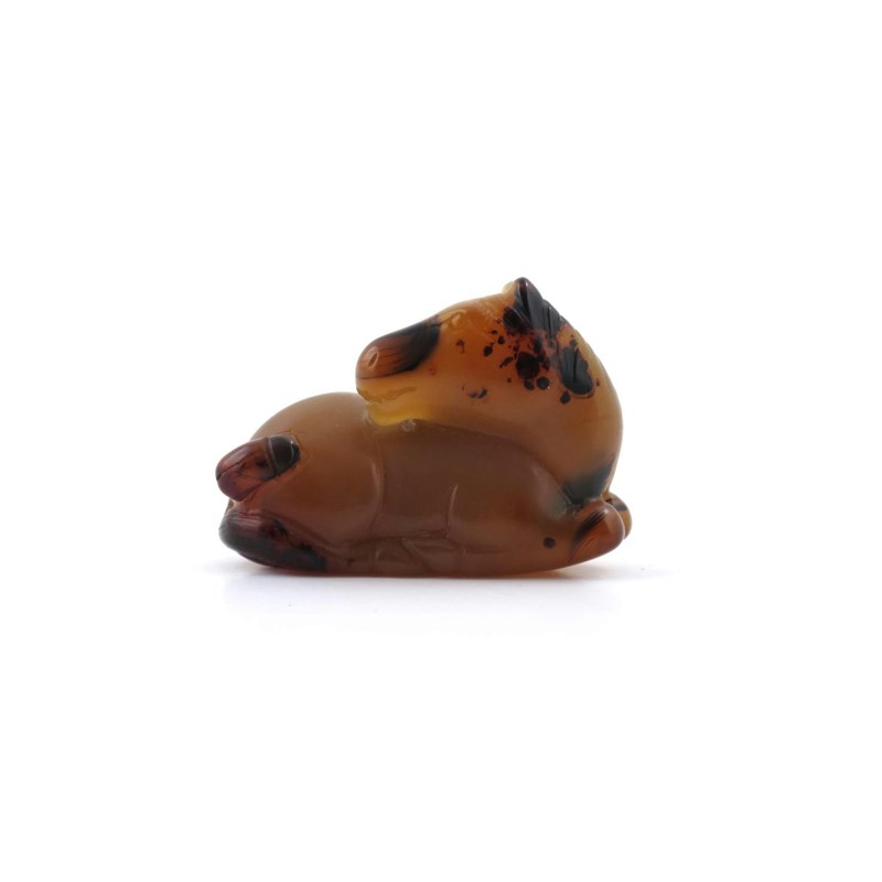 A small Chinese agate carving of a horse 19th century, recumbent with its head turned over its back, with an insect crawling on its hind leg, the stone with brown-black markings, 5.6cm.
