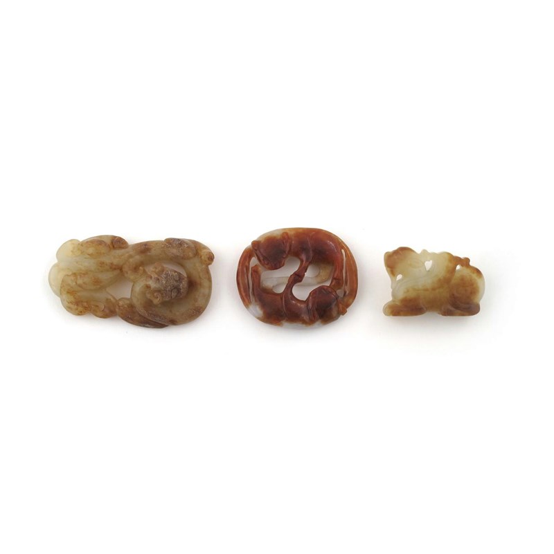 Three Chinese celadon jade carvings 19th or 20th century, one carved as two recumbent cats, another a crouching mythical beast, the third a sinuous chilong, the stones with russet-brown markings, 6.5cm max. (3)