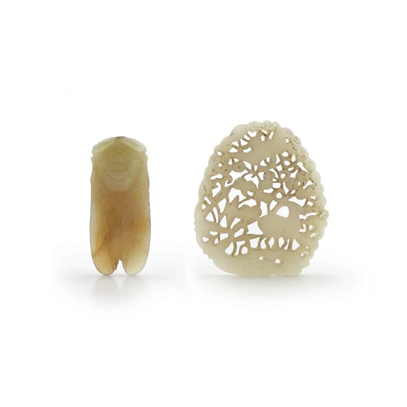 Two Chinese jade carvings probably 19th century, one formed as a stylized cicada, the other a reticulated plaque with a deer and a crane in a flowering tree, the stones in celadon and russet, 7cm. (2)