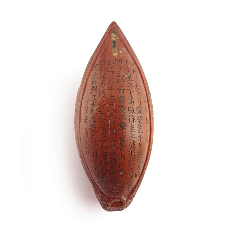 A small Chinese pale celadon jade carving of two cats 19th century, one with a brocade ball between its paws, a large lingzhi spray between them, a pair of glass opium pipe rests modelled as Buddhist lion dogs, an ivory carving of a sage standing with a tall staff, and a miniature model of a boat, inscribed with calligraphy to the base and carved from a fruit's stone, 13.2cm max. (5)