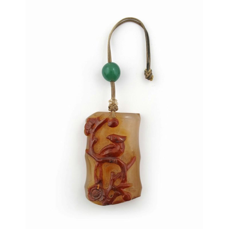 A Chinese agate pendant 19th century, formed as a section of bamboo, the front carved in relief with a bird of paradise perched on a blossoming magnolia branch, the stone in russet and orange, a green glass bead to the suspension cord, 4.5cm.