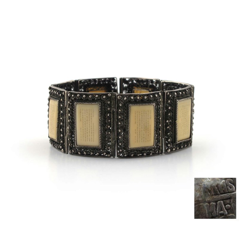 A Chinese filigree bracelet 19th/early 20th century, formed from eight rectangular articulated segments, each inset with an ivory panel depicting a minute Confucian inscription, within a border of flowerheads, one segment with impressed marks to the reverse, 6.5cm.