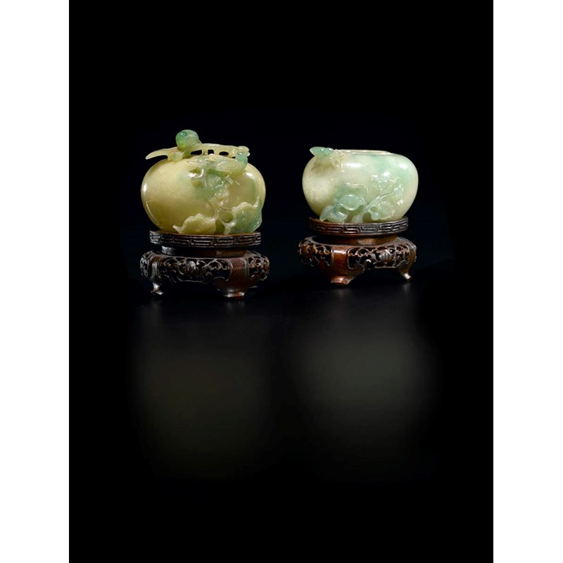 A pair of Chinese small jadeite water pots 19th century, each with a compressed circular body carved in relief, one with a cover and two birds of paradise amidst plum blossoms, the other with a butterfly, each with a reticulated hardwood stand, 5.7cm. (5)