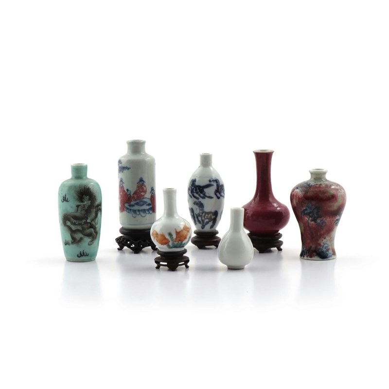 Seven small Chinese vases 19th century, two monochrome bottles, the others variously formed and decorated with dragons, fish, horses, figures and Buddhist lion dogs, three marked, four with hardwood stands, 7.6cm max. (11)