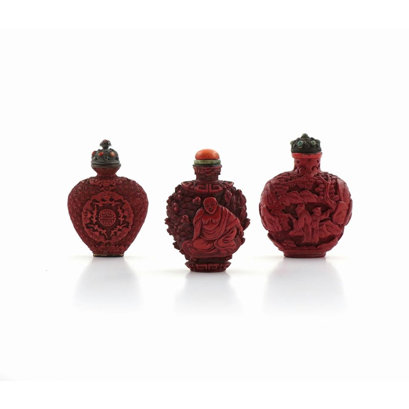λ Three Chinese red cinnabar lacquer snuff bottles 19th century