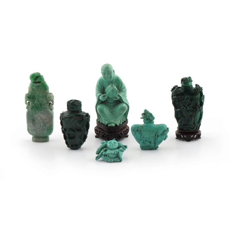 十九世紀 翡翠雕蓋瓶、鼻煙壺、綠松石羅漢及布袋和尚 一組六件