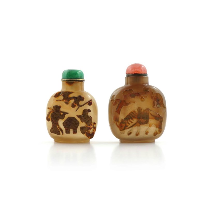 十九世紀 瑪瑙巧雕馬上封侯及松下對弈鼻煙壺 一組兩件