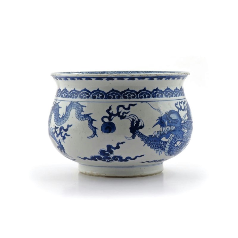 A Chinese blue and white incense burner Kangxi 1662-1722, painted to the exterior with two ferocious scaly dragons and flaming pearls of wisdom amidst cloud scrolls, all beneath a band of ruyi, 22.3cm.
