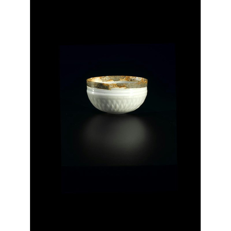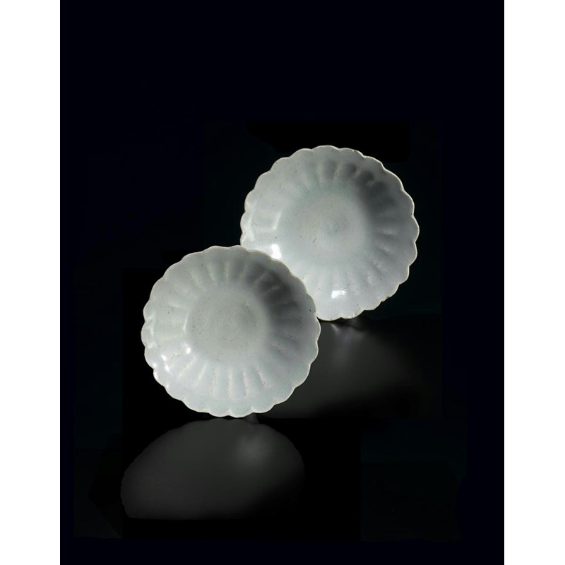 A pair of small Chinese qingbai moulded dishes Song dynasty 960-1279 AD, each flared body with petals radiating from the well and a lobed rim, together with a small qingbai U-shaped bowl, not illustrated, moulded as chrysanthemum petals, 10.4cm. (3)