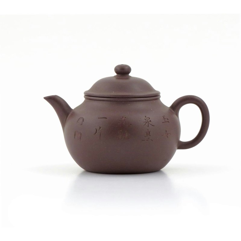 A small Chinese Yixing teapot and cover 19th/20th century, the circular body inscribed yu nü quan peng guang rong yi pian, Meng Chen, the base with a further mark for Meng Chen, 10.2cm. (2)