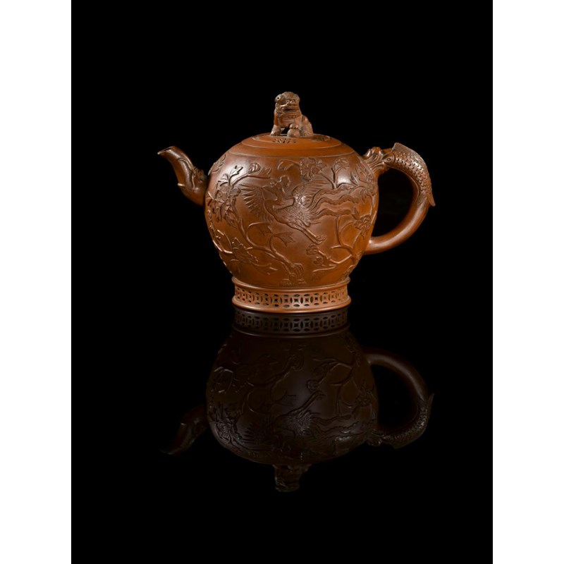 A Chinese Yixing teapot and cover, the circular body decorated with moulded flowering peony and two phoenix, the knop as a Buddhist lion dog, the handle as a fish, the spout as a mask-head, all on a hollow, cylindrical base pierced with a cash band, unmarked, 21.5cm. (2)