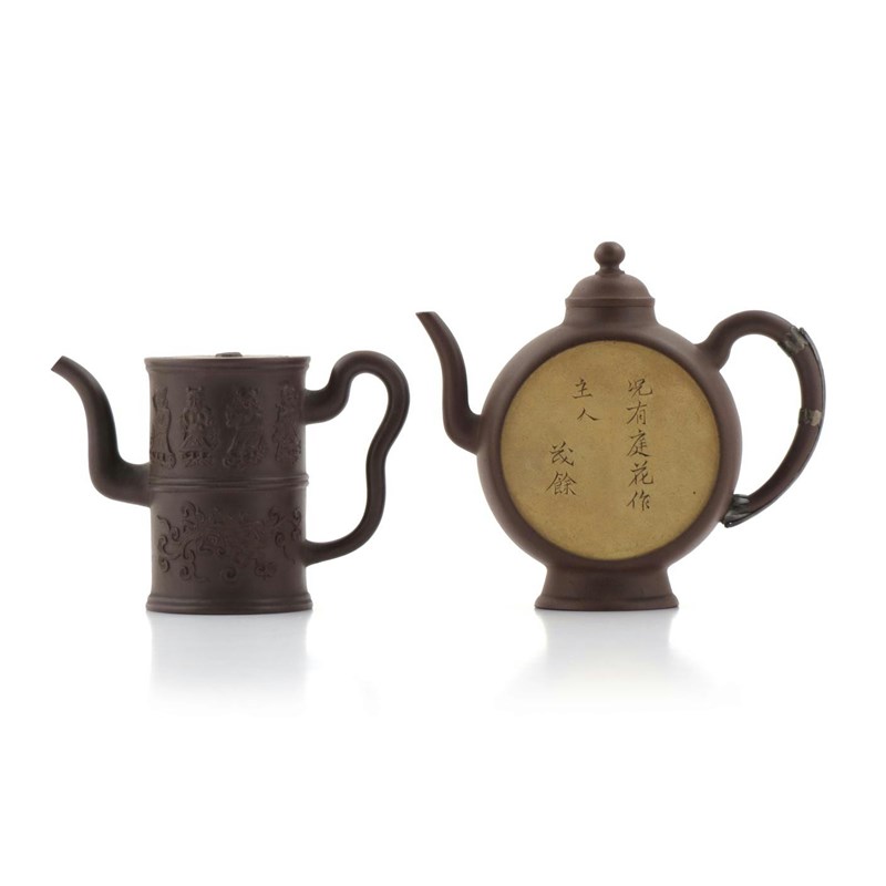 Two Chinese Yixing teapots and covers 18th/19th century, one cylindrical and decorated with moulded figures and dragons, the other of flattened circular form, inscribed to one side with a poem, with a domed cover, the handle metal-mounted, both unmarked, 19.3cm. (4)